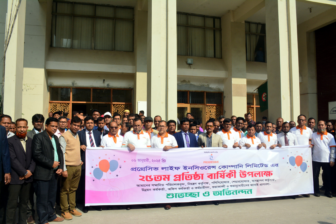 আজকের পুঁজিবাজার:সফলতার ২৫ বছরে পা রাখলো প্রগ্রেসিভ লাইফ ইনসিওরেন্স কোম্পানী লিঃ।গতকাল ৬ জানুয়ারি ২০২৫ সালে ২৫তম প্রতিষ্ঠা বার্ষিকী উপলক্ষে আয়োজিত অনুষ্ঠানে এই তথ্য জানান কোম্পানিটির মুখ্য নির্বাহী কর্মকর্তা মোহাম্মদ সাইদুল আমিন। ৬ জানুয়ারী ২০০০ সালে এই কোম্পানিটির যাত্রা শুরু হয়। ঢাকায় প্রতিষ্ঠানের প্রধান কার্যালয়ে বর্ণাঢ্য শোভাযাত্রা,আলোচনা,কেক কাটা,দোয়া অনুষ্ঠান সহ বিভিন্ন আয়োজন করা হয়েছে।