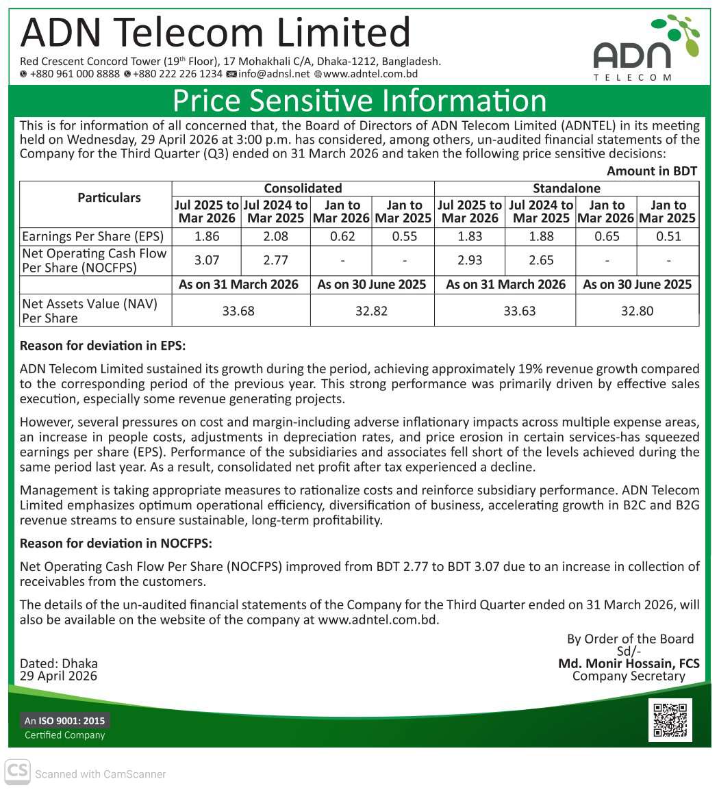 Price Sensitive Information Of ADN Telecom Limited